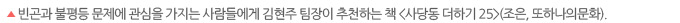 Q 장 지글러의 ‘세계의 절반은 왜 굶주리는가?’ 같은 책이 한때 많은 관심을 모았죠. 전직 인터넷서점 MD이자 빈곤과 불평등을 공부한 세이브더칠드런 직원으로서 국제개발이나 빈곤 문제에 관심을 갖는 사람들에게 추천해주고 싶은 책은 무엇인가요?