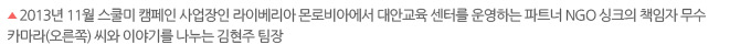 그 이야기가 계속 제 머릿속에 맴돌았어요. 학교에 가지 못할 이유는 많지만 그럼에도 학교가 가고 싶은 곳이고 배우는 게 즐겁다면 아이들은 포기하지 않을 것이라고 생각하게 되었어요. 이 아이들을 위해 서울에서 제가 할 일은 그곳 직원들과 선생님이 일을 잘 할 수 있게 해주는 것이라고 생각해요.