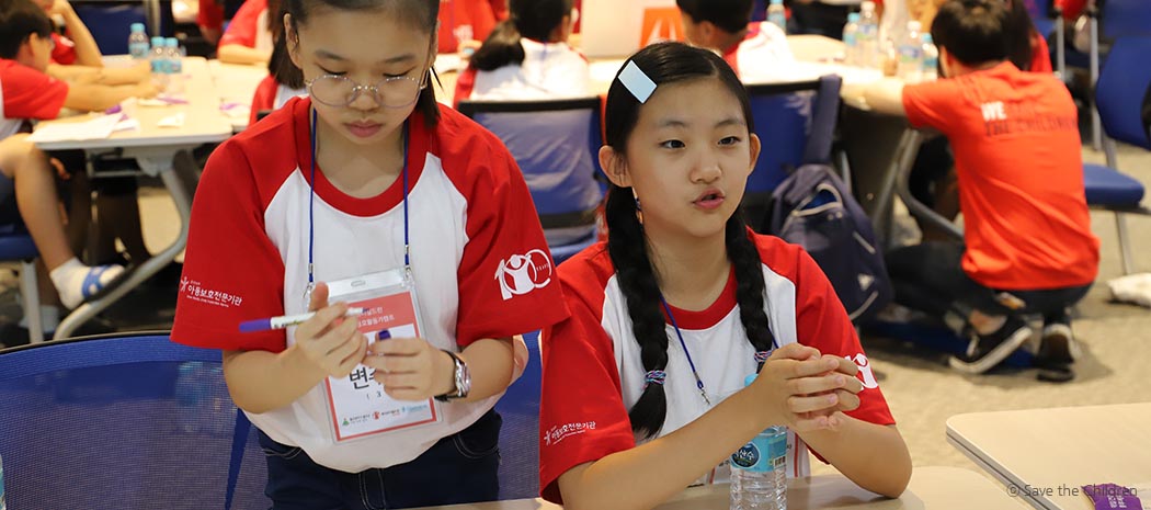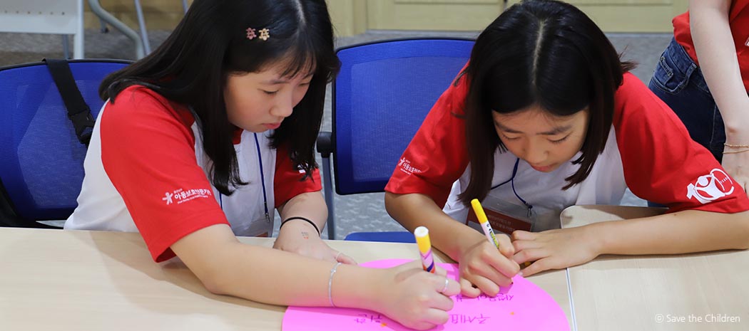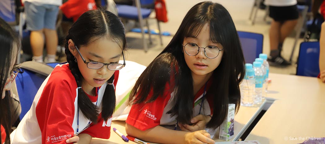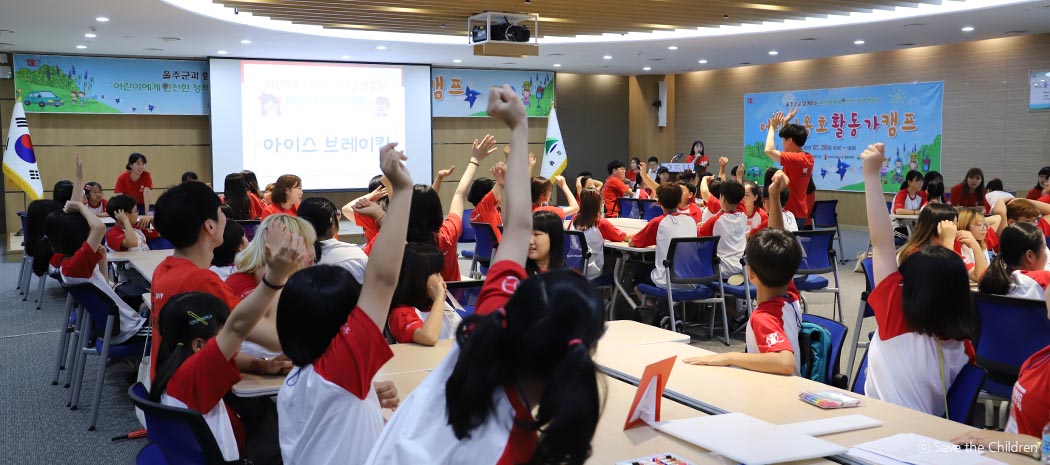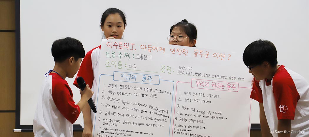 빨간색 티셔츠를 입은 아이들이 서로의 이야기에 귀를 기울입니다. 역할을 나눠서 종이에 무언가 쓰기도 하고 더 좋은 생각이 났다며 손뼉을 치기도 합니다. 2019년 7월 세이브더칠드런 동부지부와 울산광역시남부아동보호전문기관은 울산 울주군 지역 아동이 직접 정책개선에 참여할 수 있도록 ‘울주군 어린이 옹호활동가 캠프’를 열었습니다. 캠프에서 아이들은 어떻게 하면 울주군이 어린이에게 더 안전한 도시가 될 수 있을지 고민했습니다.