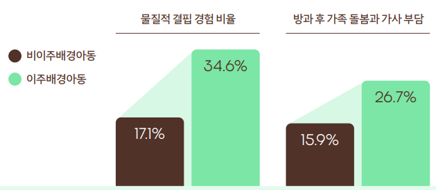 여기서 말하는 물질적 결핍은 단순히 소득이 낮다는 의미만은 아닙니다. 하루 세 끼 식사나 고기·생선이 포함된 식사, 신선한 과일과 채소, 연령에 맞는 책, 규칙적인 여가활동, 친구를 집에 초대할 수 있는 환경 등 아동이 일상적으로 누려야 할 기본적인 생활과 경험이 충분히 제공되지 못하는 상태를 의미합니다.