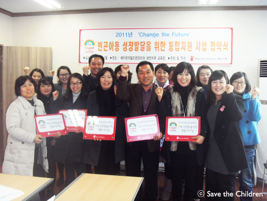 2011년부터 사업에 참여하게 된 세이브더칠드런 대전, 부산지부는 "Change the Future" 사업의 시작을 알리고, 지역사회 내 세이브더칠드런 지부를 거점으로 한 아동 통합지원서비스 네트워크 구축을 본격적으로 도모하기 위해 각각 선정된 6개 지역아동센터 및 지역사회 협약기관과 함께 1월 중, 협약식을 진행하였습니다.