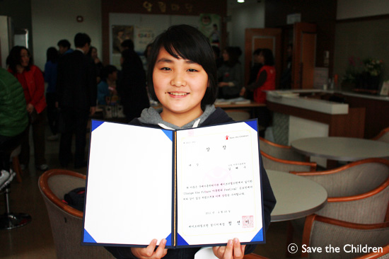 제1회 세이브더칠드런 CTF 아동권리 Festival 공모전! 138:1의 경쟁률을 뚫고 선정된 영예의 대상 수상자는 소망지역아동센터 김혜수~~!!! 탤런트 김혜수씨와 이름이 똑같지요? 얼굴도 김혜수씨 못지않게 아주 예쁜 친구였답니다. 대상으로는 상장과 함께 신발, 가방들을 구입할 수 있는 10만원 상당의 상품권이 부상으로 제공 되었습니다. 이제 중학생이 되는 혜수에게 아주 요긴한 선물이 됐을 거라 생각합니다.