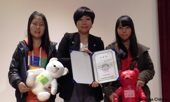 사진/ 수료증과 선물(테디베어)을 전달받은 차일드클럽 아동