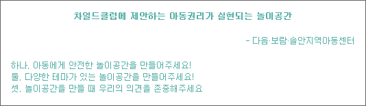 차일드클럽 아동들은 놀이터와 산책로를 돌아보며 위험한 요소가 있는지 살펴 보고 다른 아동들의 의견도 들었습니다. 이 과정에서 아동을 위해 있어햐 하는 공간이 실상은 아동이 편하게 놀기 힘든 곳임을 알게 되었습니다. 차일드클럽 아동들은 아동권리가 실현되는 놀이터를 만들기 위해 청소도 하고, 페인트칠도 하며 자신의 힘으로 할 수 있는 일을 하나 하나 실천했습니다. 자신의 노력으로 조금씩 변화되는 놀이터와 산책로를 보며 아동들은 자부심과 성취감 등을 느낄 수 있었다고 합니다. 나아가 시민의 힘을 이끌어내서 더 큰 변화를 만들어내고자 시의원을 찾아 대안 놀이 공간을 제안하기도 했습니다. 차일드클럽 아동들의 제안이 이루어져서 아동의 의견이 담긴 놀이공간이 만들어지는 날이 하루빨리 오면 좋겠습니다. 차일드클럽의 제안은 다음과 같습니다.